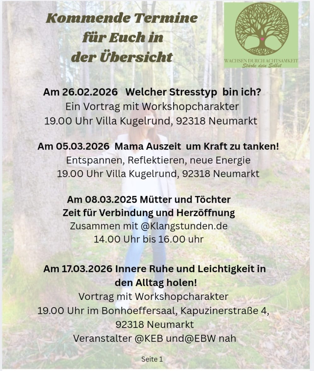 In den unterschiedlichen Workshops sind die Inhalte und Achtsamkeitstools selbstverständlich ganz individuell auf die Zielgruppe (z.B. Mutter-Tochterbeziehungen, pflegende Angehörige, Frauen in den Wechseljahren oder auch Paarbeziehungen stärken) abgestimmt, um jeweils die besten Ergebnisse zu erzielen und ein schönes harmonisches Gemeinschaftsgefühl zu erleben.